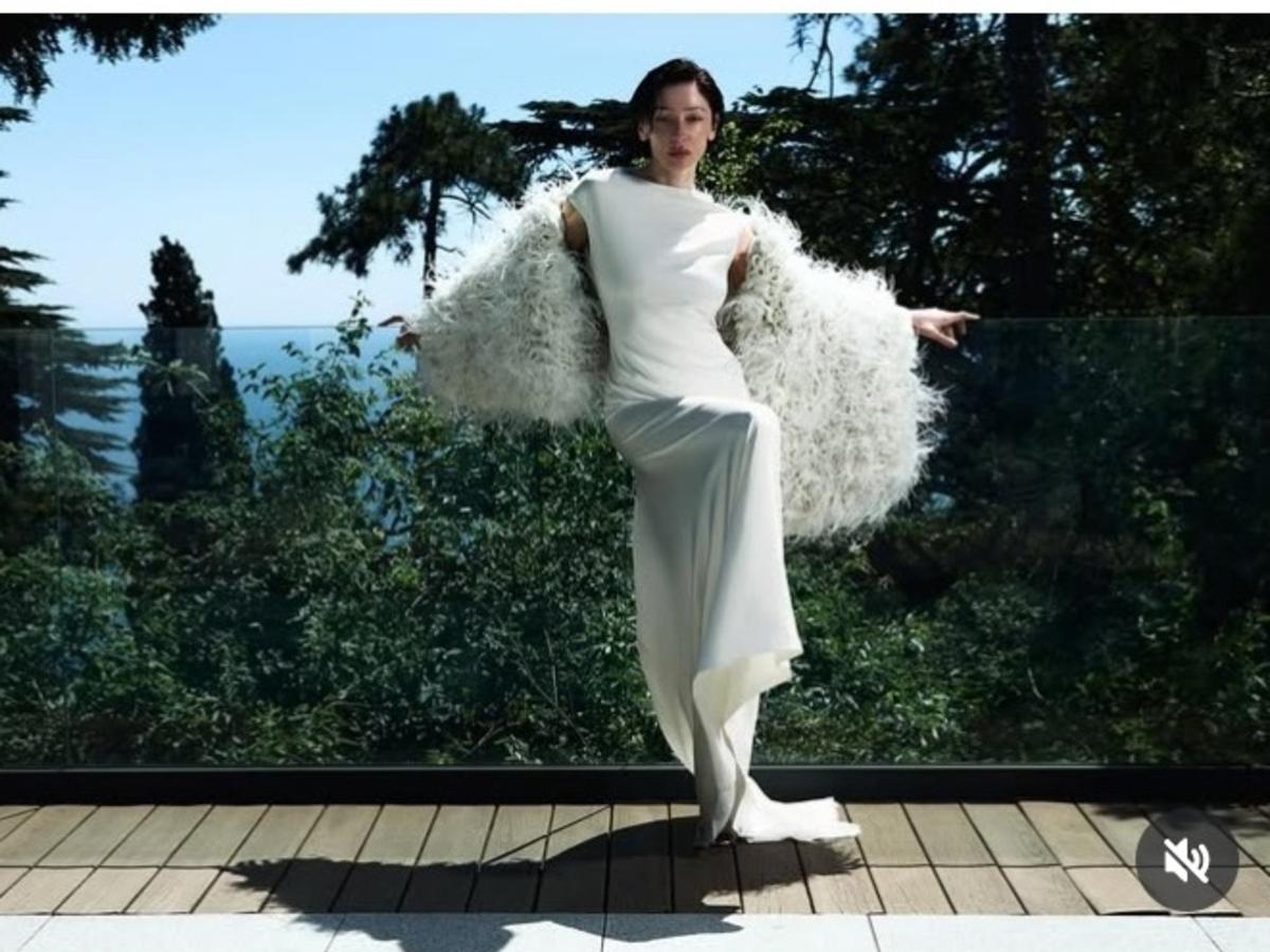Теперь счастливая супруга, вышедшая замуж за телеведущего и фермера Филиппа Бегака, опубликовала фото в другом платье. Лаконичный белый наряд украшают объёмные рукава из перьев.
