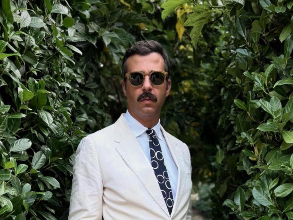 Телеведущий запечатлён на фоне деревьев в элегантном кремовом костюме, чёрном галстуке с принтом и солнцезащитных очках.