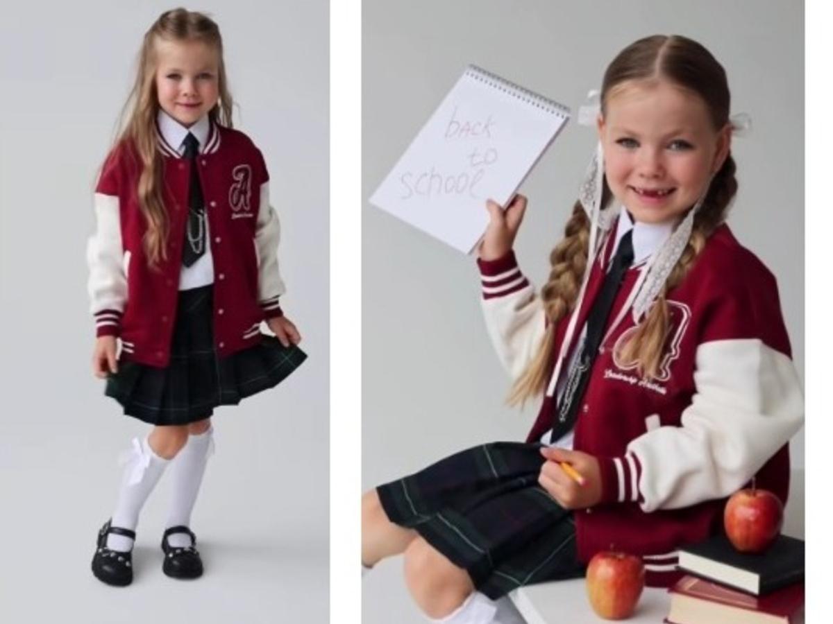 Перед учебным годом Кудрявцева устроила Маше фотосессию. Девочка позировала при полном параде. Первоклассница нарядилась в юбку, гольфы и стильный бардовый бомбер.