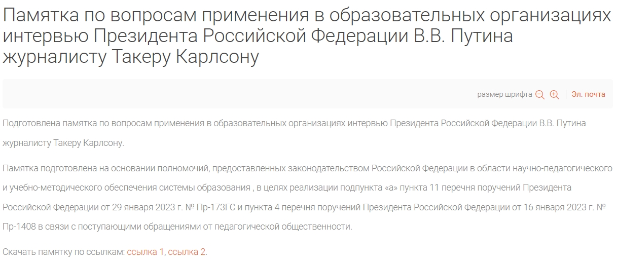 Портал "Единый урок", связанный с Министерством образования и науки, опубликовал "Памятку по вопросам применения в образовательных организациях интервью Президента Российской Федерации В.В. Путина журналисту Такеру Карлсону", в которой преподавателям советуют использовать интервью для обучения детей медиаграмотности и развития у них критического мышления.