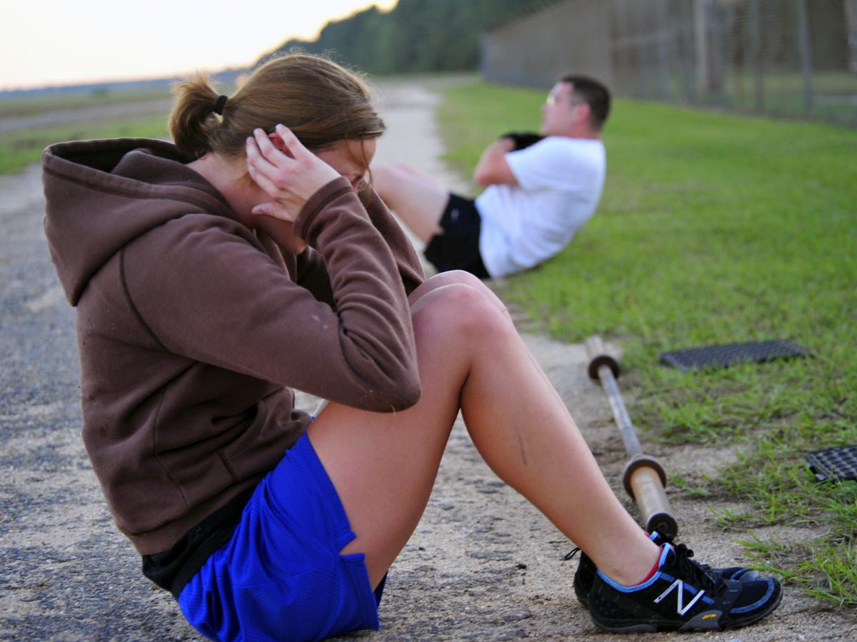 Чтобы не создавать нагрузку на шею, не пытайтесь руками прижимать голову к ногам. Вместо этого смотрите в потолок и сосредоточьтесь на том, чтобы поднять плечи и грудь к коленям.