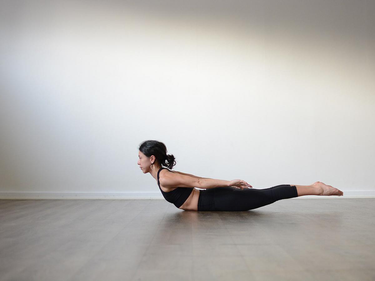 Завершает комплекс упражнение "замок" в положении лёжа. Лягте на живот, вытяните руки вперёд, подтяните живот и немного подкрутите таз. На выдохе поднимите руки и грудь, затем согните правую руку, а левую заведите за спину, будто пытаетесь сцепить пальцы. На вдохе раскройте руки в стороны и на выдохе повторите на другую сторону.