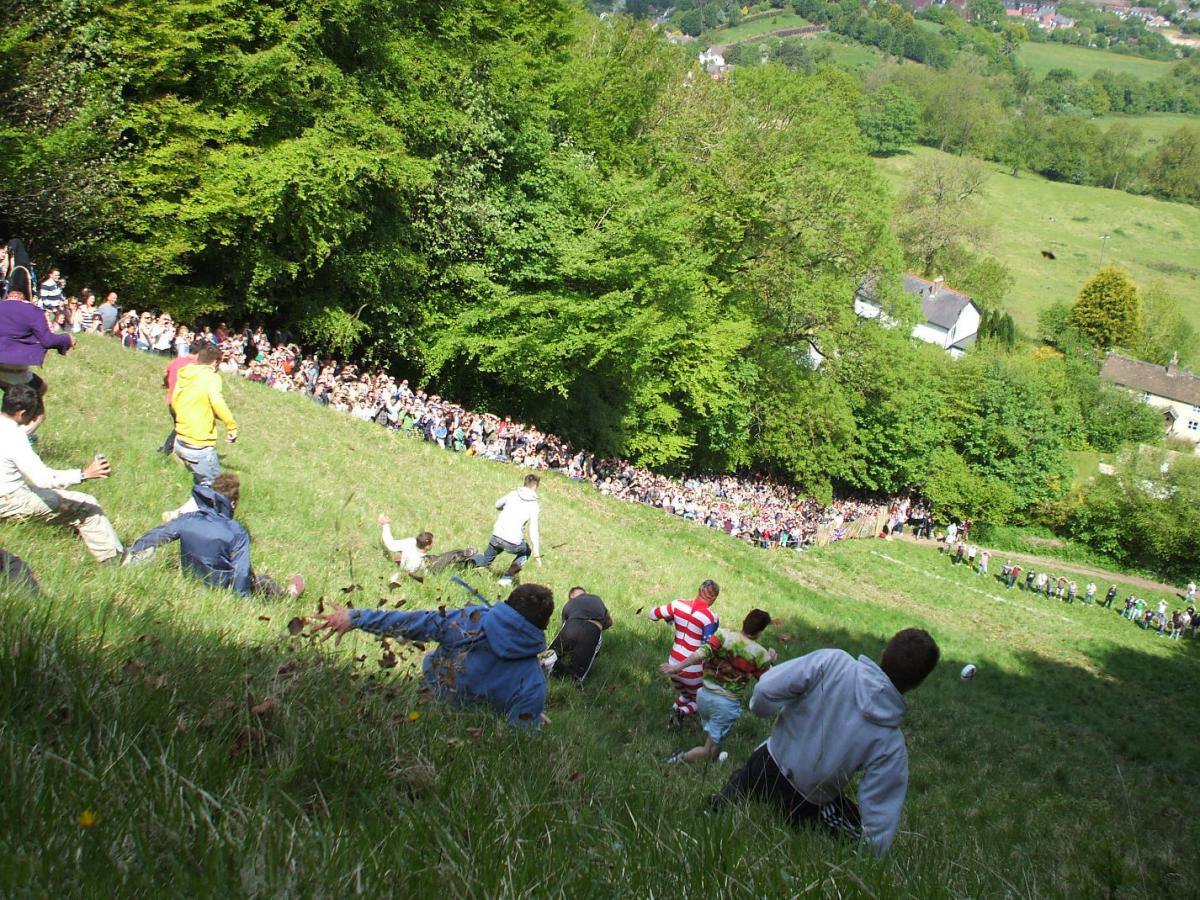В городке Глостер каждый год запускают вниз с холма головку сыра. За ней — десятки смельчаков, которые с риском для жизни (и костей) несутся следом, пытаясь догнать её. Технически никто не успевает.