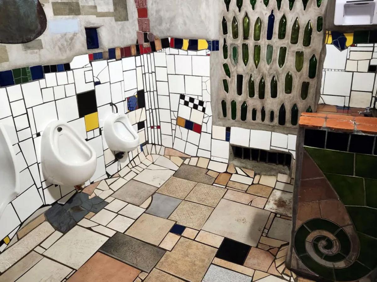 Очевидно, туалет не совсем обычный. Его построил всемирно известный австрийский архитектор и художник Фриденсрайх Хундертвассер, для работ которого характерно отрицание "концепции прямых линий". К сожалению, он не успел при жизни узнать, каким популярным стало его творение.
