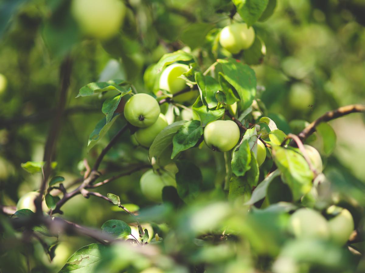 Оно похоже на яблоню с овальными листьями и зелёными плодами, но его кора имеет серо-красноватый оттенок.