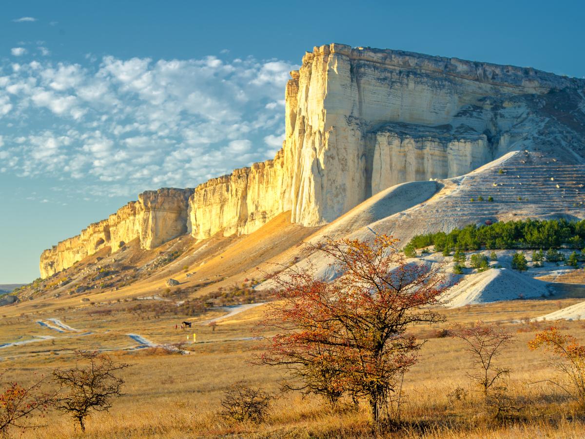 Если есть день в запасе, можно свернуть в Белогорский район. Белая скала поражает масштабом: белый известняк, степь, огромный горизонт. Особенно красиво на закате. У подножия расположены атмосферные глэмпинги — вигвамы, А-фреймы, кафе с видом. Место спокойное, подходит для тех, кто хочет почувствовать другую сторону Крыма — степную и просторную.