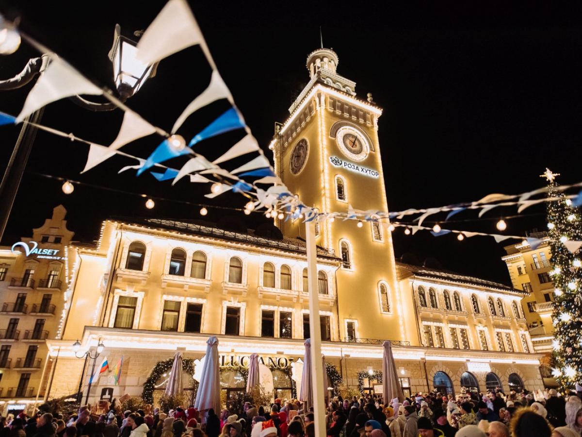 В новогоднюю ночь на главной сцене у Ратуши кроме ежедневной анимации гостей ждут поздравления Деда Мороза и Снегурочки, трансляция выступления Президента России на огромном медиаэкране и бой курантов. Специальные праздничные программы подготовлены в ресторанах и отелях курорта. "Голубой огонек" с живой музыкой, оливье с дальневосточным гребешком и крабом, а также другими кулинарными изысками зажжётся в ресторане "Дичь". В "Варежке" откроют тайны русской души, в отеле Rosa Springs 2026 год встретят в атмосфере русской сказки.