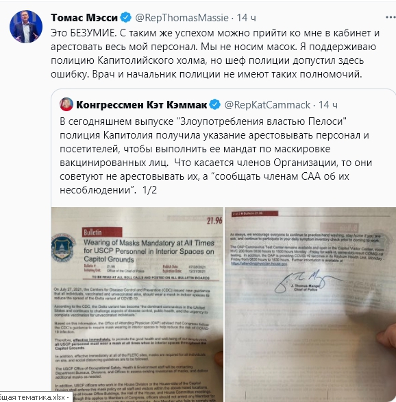 "Если посетитель или сотрудник не наденет маску после того, как его попросят об этом, ему будет отказано во входе в здания Палаты представителей или в ту часть Капитолия США, которая принадлежит палате. Любое лицо, которое не выполнит требование или не покинет помещение после того, как его попросят сделать это, будет подвергнуто аресту за незаконный вход", — говорится в документе.