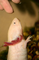 И последнее. Эти животные обладают весьма тонкой и чувствительной кожей, поэтому ни в коем случае их нельзя брать в руки! Температура их тела на 10°С ниже, чем у нас, поэтому человеческое прикосновение может обжечь их. Лучше всего при переноске животного из одной емкости в другую использовать сачок с мелкой сеткой (в сетке с крупной ячеей аксолотль может запутаться и повредить себе лапу или хвост).
