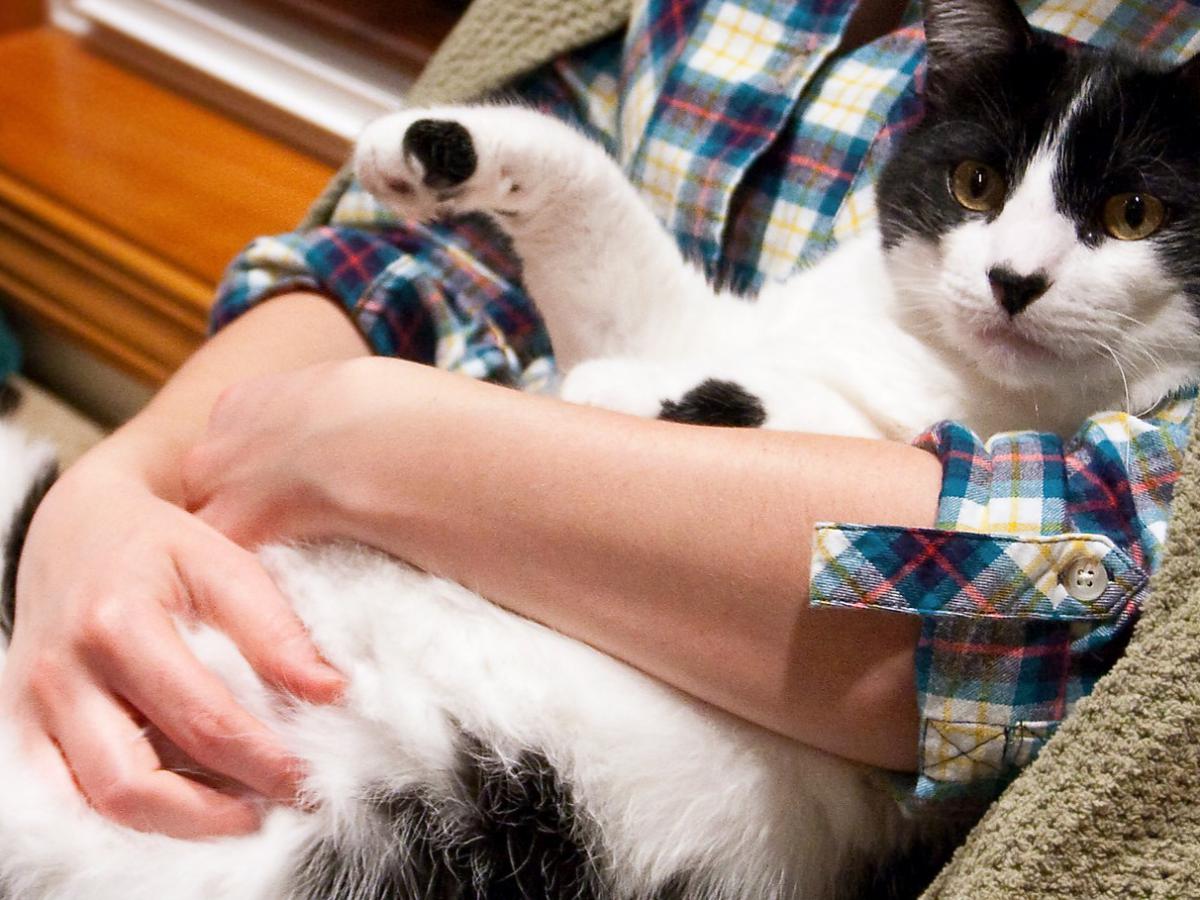Затем можно взять питомца. Одну руку следует положить под грудную клетку, избегая контакта с животом. Другой рукой же поддерживаются задние лапы. Как только почувствуется, что кошке удобно, можно поднимать ее и нежно прижимать к себе. Важно сохранять спокойствие. Рука, поддерживающая задние лапы, должна быть опорой для животного, поэтому ее можно положить на туловище выше пупка.
