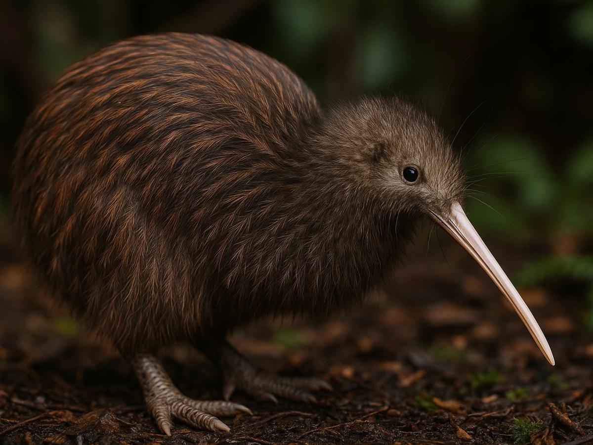 Длина тела киви варьируется от 35 до 65 сантиметров, вес — от 1,3 до 4 килограммов у самых крупных видов. Внешне они больше напоминают пушистые комочки с длинным клювом, чем классических птиц. Их обоняние развито настолько, что по этому параметру они выделяются среди пернатых. Ноздри расположены на кончике длинного клюва, что позволяет им находить червей и насекомых, зарытых в влажной почве. Коричневатое, жестковатое оперение отлично маскирует их в густом подлеске, снижая необходимость убегать от врагов.