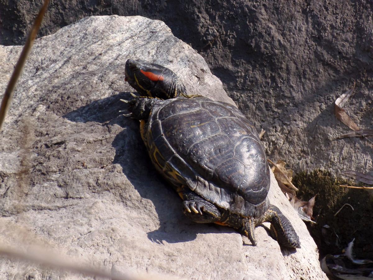 Узнать этих черепашек легко: у них есть красные отметины по обе стороны головы, благодаря которым они и получили своё название. Молодые особи окрашены в яркий зелёный цвет, а по мере взросления их панцирь темнеет и становится более массивным.