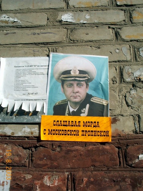 Впрочем, у Леонида Маевского оставался ещё один шанс показать себя народу, что называется, лицом. Я имею в виду наглядную агитацию В городе появились плакаты с изображением кандидата Маевского. Практически на всех своих выступлениях Маевский появлялся в форме морского офицера и этот плакат не стал исключением. Любят у нас офицеров.. особенно женщины и редко кто из политиков отказывает себе в удовольствии пощеголять перед прессой в военной форме (вспомним явление народу полковника Жириновского). Ход беспроигрышный. Поможет ли он Маевскому покажет время. А пока под плакатом появились надписи следующего содержания: «слащавая морда с московской пропиской». Не любят в провинции варягов… особенно московских. Шансов выиграть битву за губернаторское кресло маловато даже у офицера… если только этот офицер не Лебедь.