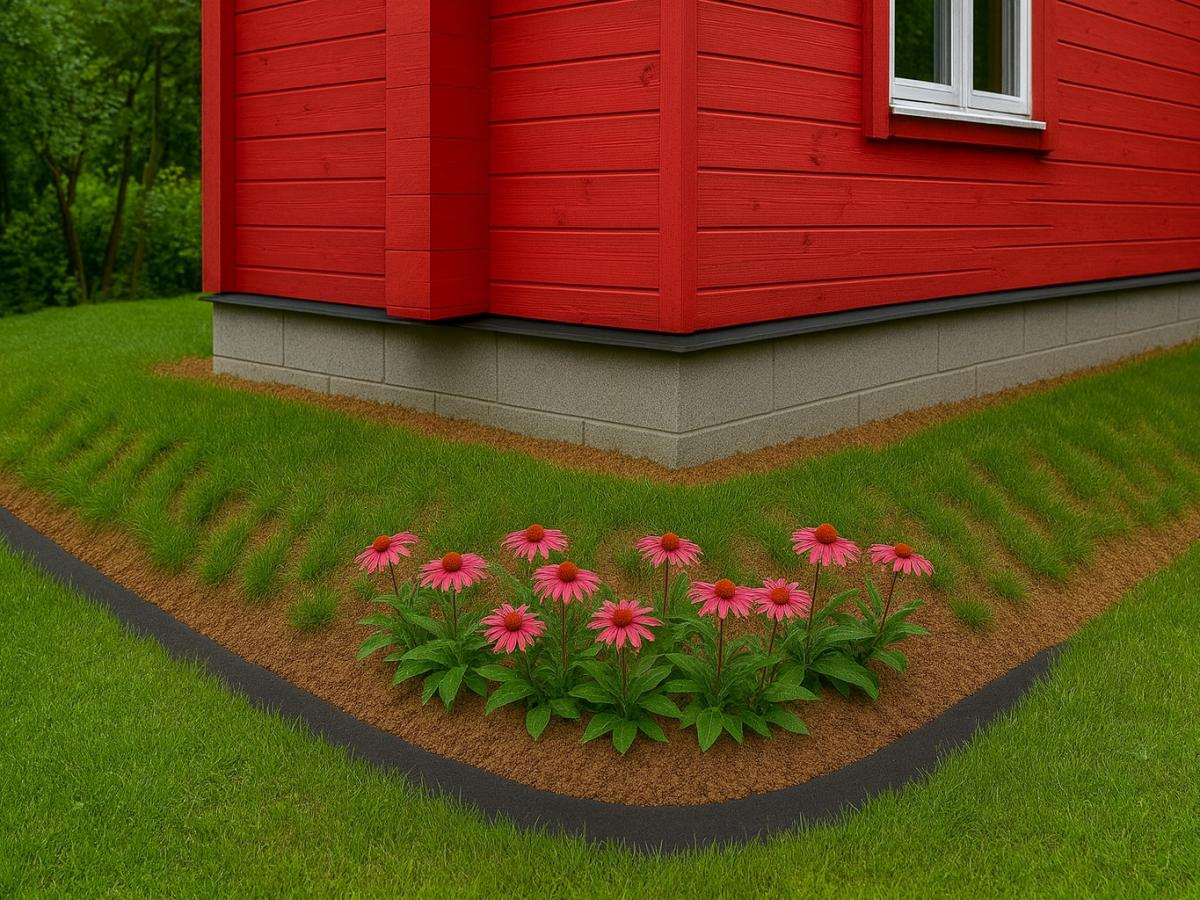 Эта конструкция работает как природный барьер для влаги. Осадки не скапливаются у стен, а равномерно впитываются почвой и уходят вглубь, не создавая наледи и не подмывая фундамент. Такой метод не ограничен формой строения и подходит как для большого дома, так и для небольших садовых построек.