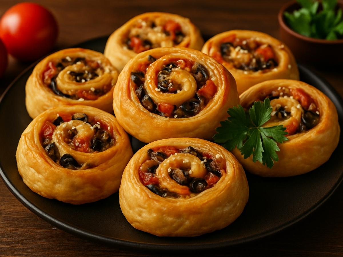 В основе блюда — доступные продукты, которые легко найти в любое время года. Слоёное тесто избавляет от необходимости долгого замеса, а сочетание грибов с томатами делает начинку сочной. Маслины добавляют пикантный акцент, сыр — мягкость, а сушёные травы усиливают аромат. Благодаря плотности начинки рулетики хорошо держат форму и после выпечки остаются аккуратными.