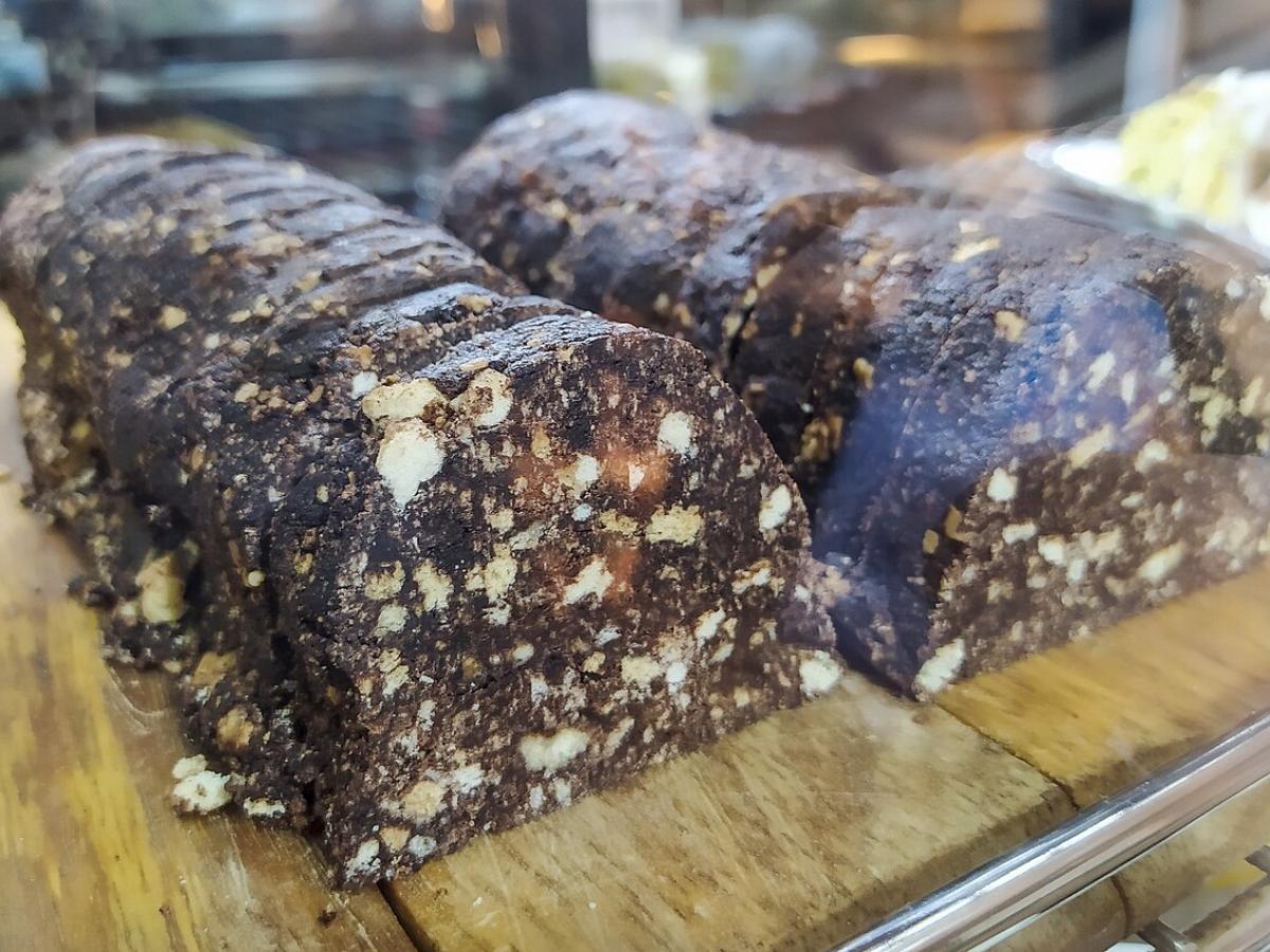 Сочетание темной начинки и светлого бисквита создает красивую мозаику при разрезании, отсюда и название этого невыпеченного десерта — рождественская салями.