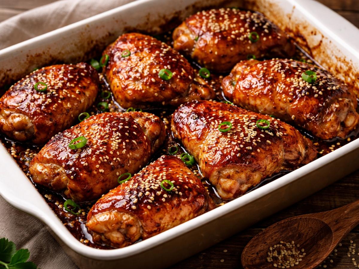 Перед запеканием курицу выкладывают в форму и посыпают кунжутом — он подрумянивается и создаёт аппетитный ореховый акцент. Запекают при 200 °C около 35-40 минут, пока не появится тёмная карамельная глазурь. Готовое блюдо подают горячим, поливая соусом, который собрался на дне формы.