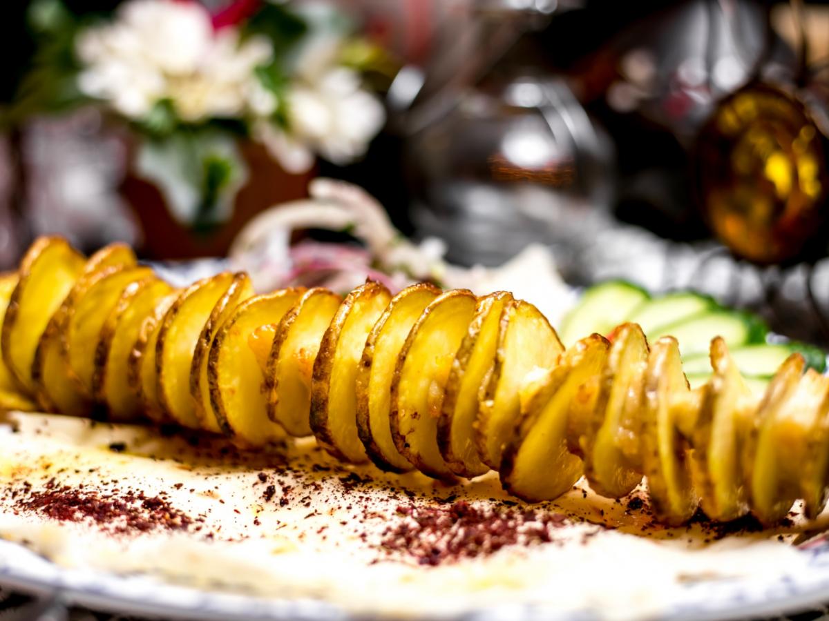 Рождественская ярмарка — это не только сладости, но и сытные закуски. Среди них особое место занимает картофель, нарезанный спиралью и запечённый до хруста. Его часто называют картофелем «торнадо» из-за характерной формы и подачи на деревянной шпажке.