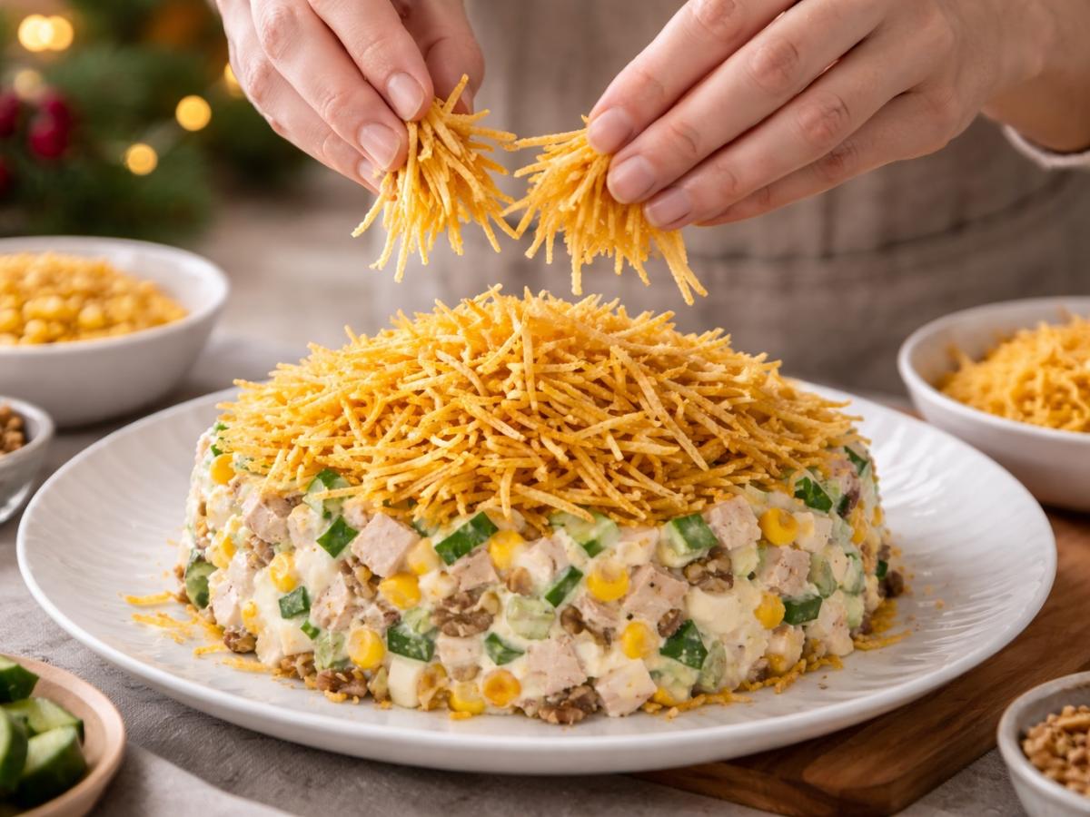 Основа блюда получается вкусной и насыщенной: сочная курица, свежие овощи и орехи создают мягкий, сбалансированный вкус. Сверху появляется хрустящий слой картофеля пай, который превращает традиционный салат в блюдо с яркой подачей. Контраст между нежной структурой и хрустящей текстурой делает салат особенно интересным. Хрустящий слой усиливает вкус и создаёт выразительный акцент в подаче.