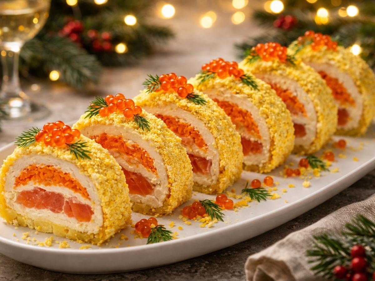 Когда хочется подать что-то эффектное и праздничное, но времени на сложные блюда совсем мало, этот рулет становится идеальным решением. Он собирается быстро, выглядит как ресторанная закуска и отлично держит форму после охлаждения. Блюдо подходит для новогоднего стола и не требует особых навыков.