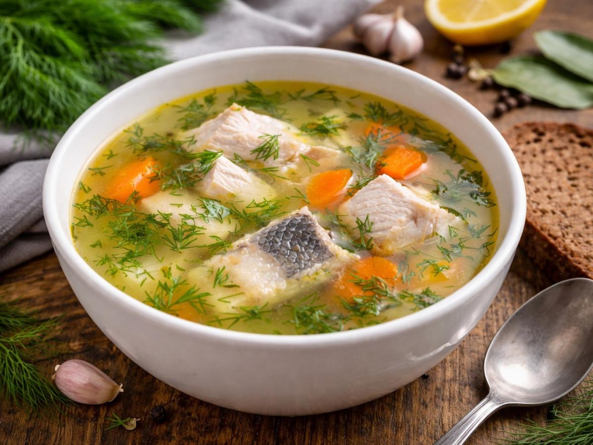 Классический набор включает рыбу, лук, морковь, лавровый лист, чёрный перец и свежую зелень. Именно простота делает этот суп особенно удачным после праздников.
