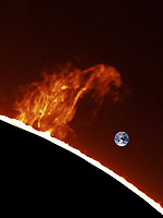 Солнечная вспышка — явление, поражающее воображение. Протуберанцы (от лат. protubero — вздуваюсь) — плотные конденсации относительно холодного (по сравнению с солнечной короной) вещества, которые поднимаются и удерживаются над поверхностью Солнца магнитным полем.