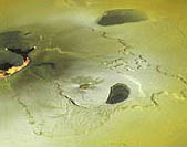 Очень любопытный вулканический объект — Патер Ра, от которого отходят радиальные змеевидные потоки. Они тянутся на расстояния до 200 километров, при этом их цветовые оттенки меняются от коричневого до светло-оранжевого и снежно-белого. Природа этих потоков пока неясна.