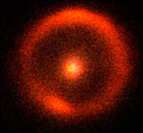 И вот недавно объединенная группа астрономов из США и Нидерландов под руководством Симоны Вегетти, исследуя систему JVAS B1938+666, обнаружила подобный эффект. Ученые тщательно изучили ее изображения при помощи наземного телескопа Кек 2, а также космического телескопа "Хаббл". Выяснилось, что эта система состоит из двух галактик, причем расположенная на меньшем расстоянии от нас массивная эллиптическая играет роль той самой гравитационной линзы. А поскольку элементы системы JVAS B1938+666 и Земля находятся практически на одной линии, то можно наблюдать классическое кольцо Эйнштейна диаметром в ~0,9 угловой секунды.