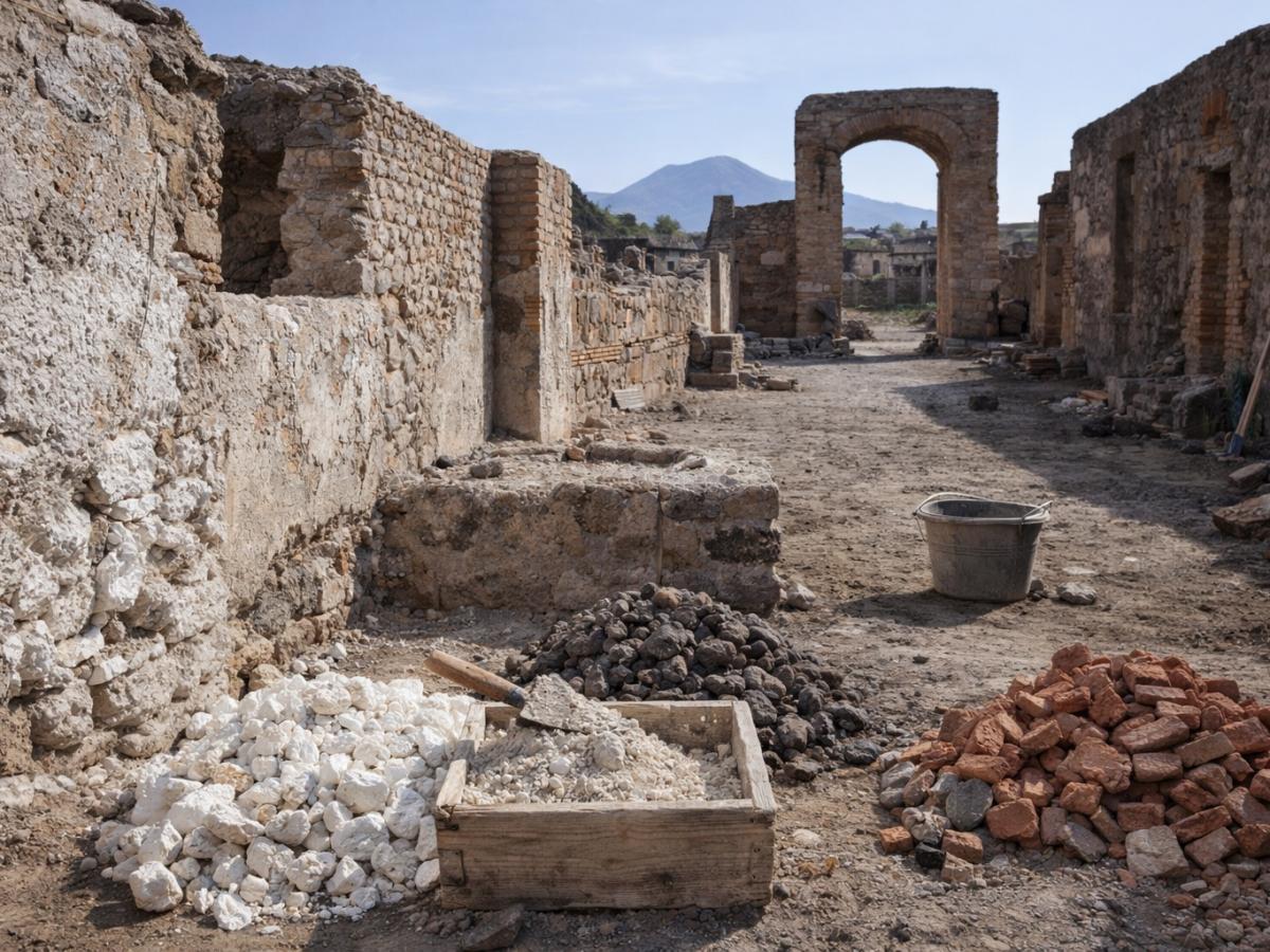 Во время извержения Везувия в 79 году нашей эры Помпеи оказались погребены под слоем вулканического пепла толщиной до шести метров. В одном из домов в этот момент шли ремонтные работы. Когда международная команда исследователей вернулась к раскопкам участка в 2023 году, перед ними открылся редкий для археологии сценарий: наполовину возведённые стены, строительные инструменты и груды необработанных материалов.