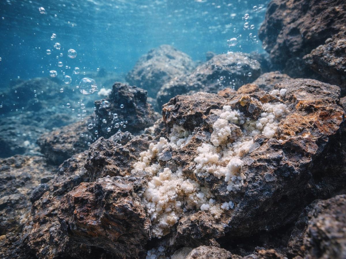 Главное открытие связано с химическими процессами внутри этих пористых образований. Растворённый в морской воде CO₂ вступает в реакцию с минералами вулканических пород и превращается в карбонат кальция. Он постепенно цементирует породы, надёжно связывая углерод в твёрдой минеральной форме.
