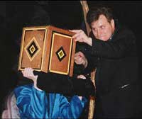 - Ничего особенного, -- говорит он. — Я делаю все то же самое, но за гораздо меньшие деньги... Когда я видел трюки Копперфильда, записанные на кассетах -- это одно, когда вживую смотрел его выступление в Москве -- это другое. У него собственная студия, операторы которой снимают все это так, чтобы создать ореол загадочности. А когда он выступал в столице, зрители находились очень далеко, им запрещалось вести собственную съемку. А я смотрел и легко разгадывал все его хитрости. Упрощенно говоря: все его чудеса процентов на восемьдесят сделаны за счет особой съемки. У нас же контакт со зрителями гораздо теснее. Я бросаю в зал мячики, шарики, и те, кто их ловит, становится нашими ассистентами. Мы пилим их на части, сжигаем головы, обрубаем их гильотиной. Скажу больше -- ближе контакта со зрителем, чем у нас, нет ни у одного российского иллюзиониста !