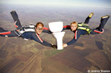 В общем, воздушные акробаты — скайдайверы — способны пошутить на любом расстоянии от земли. Для того же унитаза достаточно и километра. Если своими телами герб города к юбилею оного рисовать или просто слово матерное в воздухе написать, то лучше километров с двух сигануть. Пропагандировать воздушный нудизм предпочтительнее поближе к земле, а то наверху холодно, не дай бог отморозишь себе чего-нибудь. Ну а дни рождения отмечать или свадебные застолья устраивать лучше на высоте километров трех, чтоб успеть хотя бы по паре бокалов шампанского выпить.