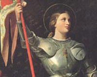 Жанна не обращала английских наемников в бегство мановением своего штандарта, напоминает член французской Академии истории Робер Амбелен в "Драмах и секретах истории" ( Robert Ambelain. "Drames et Secrets de L'Histoire. 1306 — 1643 ). Сама Жанна признавалась, что "многократно" поражала врагов своим мечом из Фьербуа. Кроме меча, в боях она использовала топор. На специально изготовленном для нее боевом топоре была выгравирована буква J - первая буква ее имени Jeanne, увенчанная короной! Между прочим, корона содержит столько же цветков, сколько их насчитывает корона в гербе Карла VII. В геральдике такая корона принадлежность "принцев крови". Ей предоставлено право иметь свой стяг — привилегия знатных сеньоров-баннеретов.