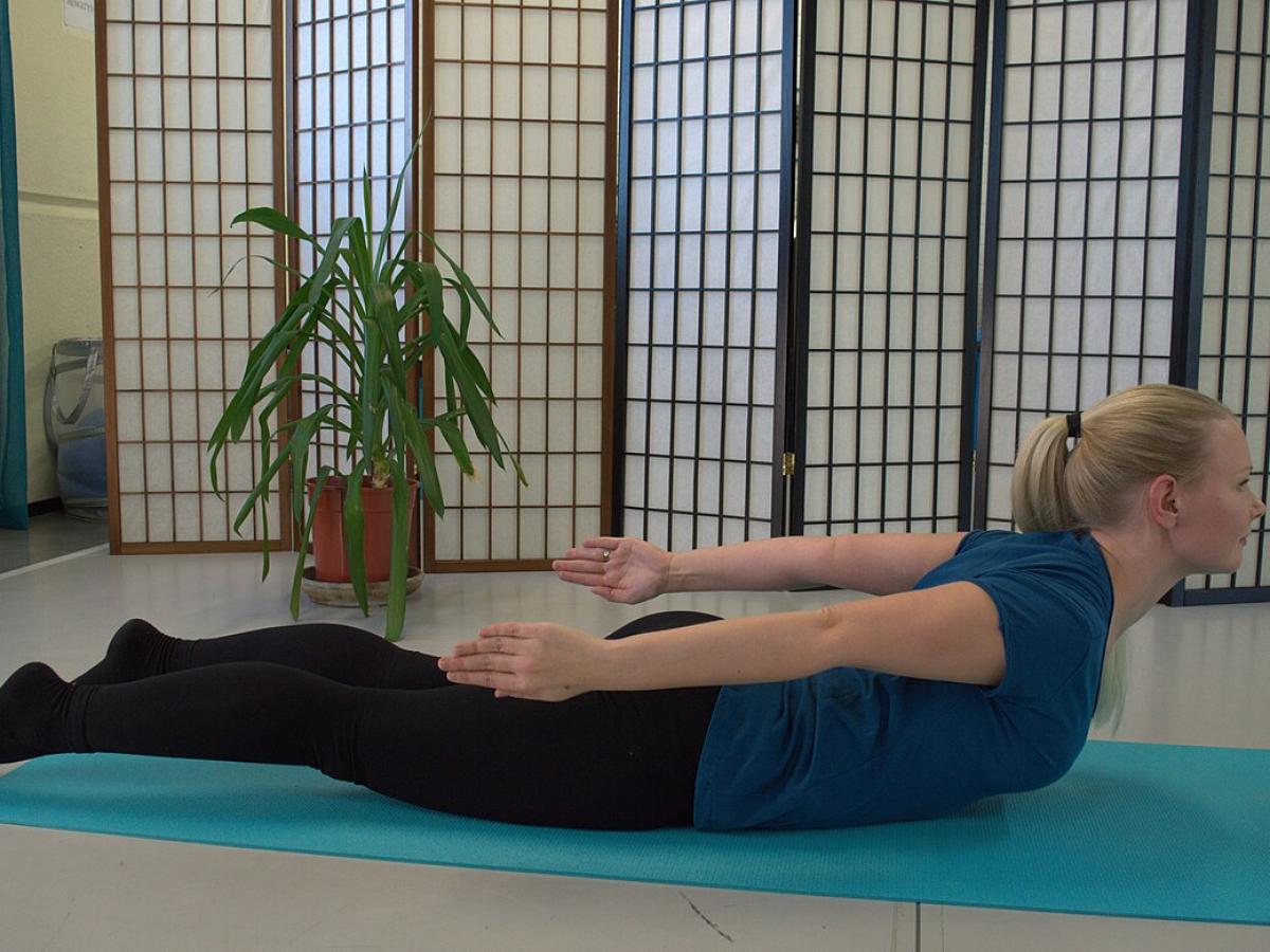 Супермен. Лёжа на животе, поднимайте грудь и ноги на небольшую высоту, не закидывая голову. Движение укрепляет разгибатели спины и помогает бороться с привычкой "складываться" вперёд.