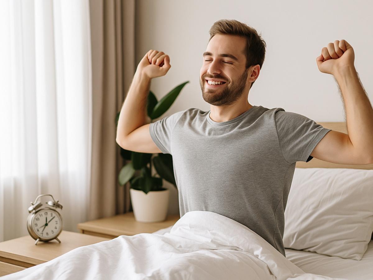 Не стоит начинать день резким подъёмом. Дайте телу 1-2 минуты, чтобы перейти от сна к бодрствованию. Полежите с закрытыми глазами, спокойно подышите и слегка потянитесь — руками вверх, ногами вниз.