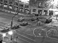 В четыре утра внутренние войска пошли вперед. Сидевшие в БТР первыми ощутили на себе ярость толпы. Митингующие лупили их чем попало, прыгали сверху, загораживая обзор, чтобы те наехали на людей. Тем самым провокаторы хотели увеличить число жертв.