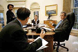 Фото: Так в Вашингтоне решают судьбы народов; слева направо:советник президента по национальной безопасности К.Райс, бывший спичрайтер Д.Фрам, бывший помощник президента по связям с общественностью К.Хагес, президент США Дж. Буш .