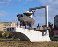 Сходный памятник быку — гордости сельского хозяйства можно увидеть в одном из заброшенных сел Украины. В свое время местных совхоз славился своими племенными производителями, и статуя при въезде изображает советского богатыря, укрощающего исполинского быка.