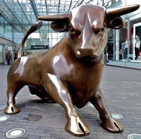 В Америке монументов быков и коров тоже предостаточно. Самый известный — "Атакующий бык", стоящий перед зданием нью-йоркской бирже. Скульптор Артуро Ди Модико создал этого бронзового гиганта весом в 3,2 тонны в качестве рождественского подарка жителям Нбю-Йорка в 1989 году — чтобы морально поддержать горожан после обвала фондового рынка в 1987 году. Создавал эту скульпутру Ди Модико два года и потратил на нее более 300 тысяч долларов. Поскольку "сюрприз" был установлен без разрешения городских властей, полиция скульптуру хотела убрать, но горожанам так понравился этот трехтонный подарочек, что власти вынуждены были пойти на уступки и вернуть Быка на мест. Сегодня "ChargingBull" символ процветания Америки и любимая достопримечательность туристов.